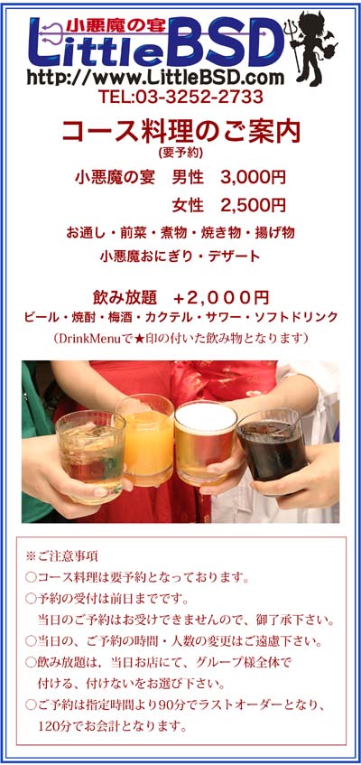 営業時間 17:00〜23:00(平日 18:00〜22:30)(金土祝前日 翌日5:00) Copyright 2004 LittleBSD [email protected] Tel:03-3252-2733